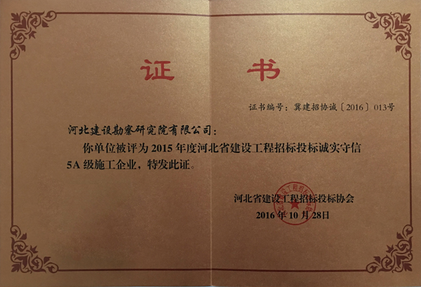 近日,公司被河北省建設工程招標投標協會評為2015年度河北省建設工程招標投標誠實守信5A級施工企業單位。
