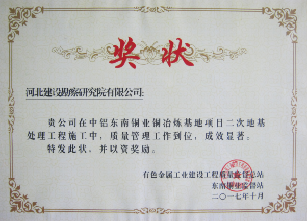 公司承接的福建省寧德市中鋁東南銅業銅冶煉基地項目二次地基處理工程,施工中嚴格執行公司規章制度及綜合管理體系標準,精心策劃,嚴格控制,科學管理。在現場10多家施工單位各項檢查評比中,得到了業主中鋁東南銅業有限公司的表揚,對現場安全、質量、進度管理給予了高度評價,分別授予“項目管理突出”獎和“質量管理”獎。