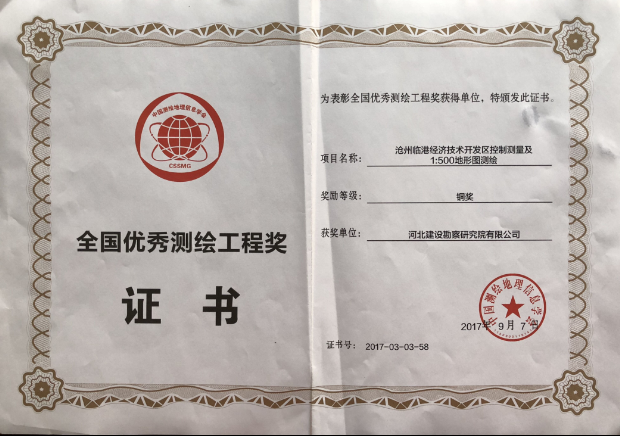2017年9月7日,由我公司完成的滄州臨港經濟技術開發區控制測量及1:500地形圖測繪項目,被中國測繪地理信息學會授予全國優秀測繪工程銅獎。