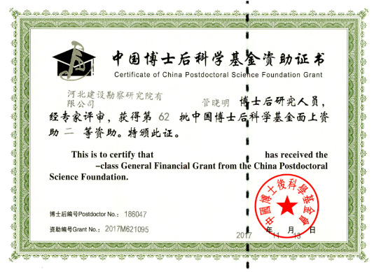 根據(jù)《中國博士后科學(xué)基金面上資助實施辦法》,公司在站博士后管曉明的《非飽和地層盾構(gòu)隧道開挖面穩(wěn)定性與控制研究》,榮獲中國博士后科學(xué)基金第62批面上二等資助5萬元。