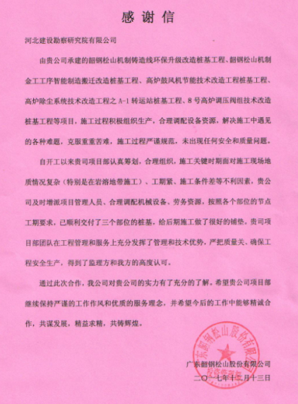 由我公司施工的韶鋼煤氣高效綜合循環利用改建工程,克服了施工過程中的各項難題,已順利交付三個部位樁基,得到了廣東韶鋼松山股份有限公司的高度認可,特向公司發來感謝信。