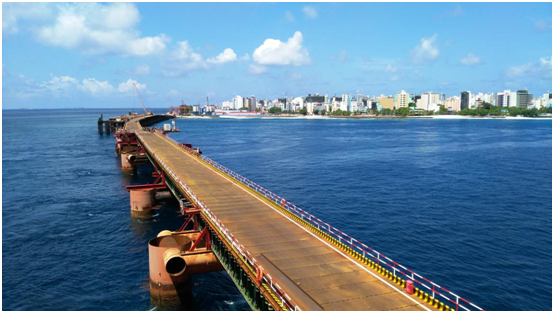 中馬友誼大橋位于馬爾代夫北馬累環礁(North Malé Atoll),跨越Gaadhoo Koa海峽,連接環礁上馬累島、機場島(瑚湖爾島)兩個相鄰島嶼,是馬爾代夫重要的島嶼連接線工程。項目起點位于馬累島東南角,順接規劃Boduthakurufaanu Magu道路,隨后設置橋梁跨越Gaadhoo Koa 海峽,在機場島南段登陸,大橋接線與機場到Hulhumale 規劃路順接,全橋長度2km,雙向四車道,由橋梁、引堤、道路等工程組成,主橋為主跨180m混合疊合梁連續鋼構橋,引橋為蓋梁混凝土預制梁橋。項目采用中國公路工程規范標準,設計使用壽命100年。