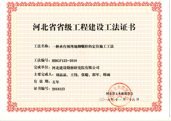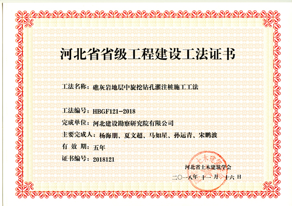 近日,河北省土木建筑學會組織專家對建筑施工企業申報工法進行了評審,我公司申報的礁灰巖地層中旋挖鉆孔灌注樁施工工法、鉆孔灌注樁泥漿凈化處理施工工法、一種承臺預埋地腳螺栓的定位施工工法,被評為2018年度省級工程建設工法。