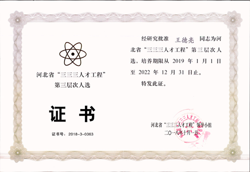我公司王德亮榮獲河北省“三三三人才工程”第三層次人選