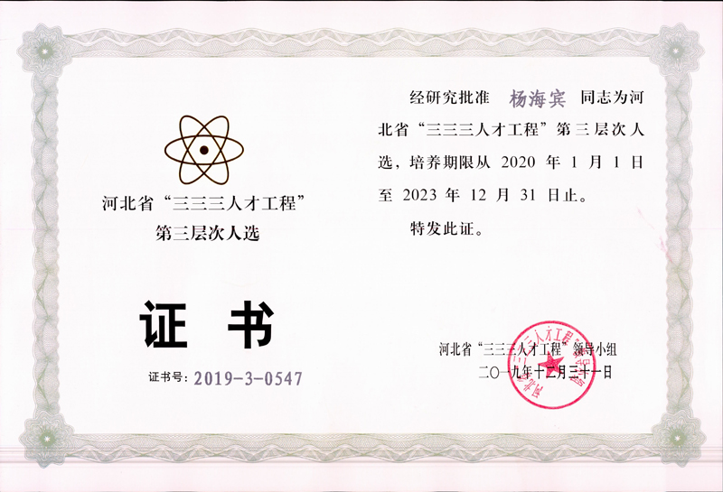 經(jīng)公司推薦,石家莊市人力資源和社會(huì)保障局組織評(píng)審,省人力資源和社會(huì)保障廳備案,我公司宋鵬波、楊海賓兩位同志榮獲2019年度河北省“三三三人才工程”第三層次人選。