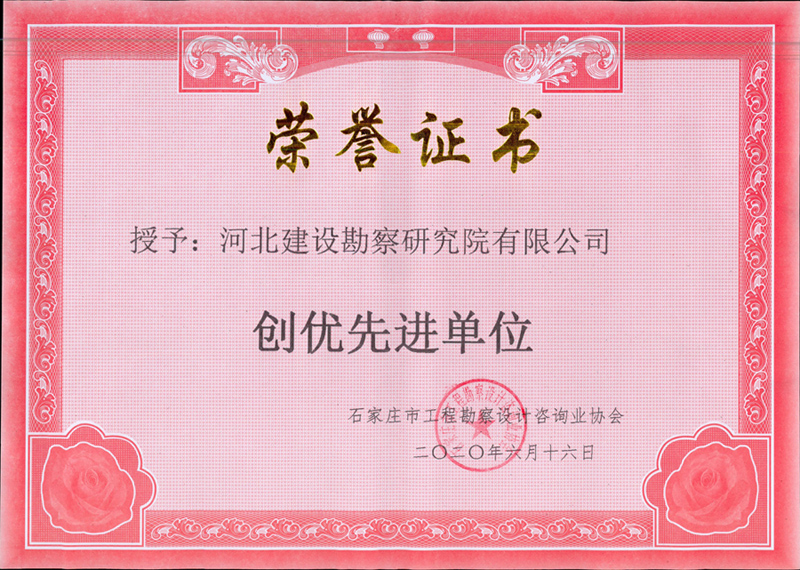 2020年6月22日,石家莊市工程勘察設計咨詢業協會下發文件《關于公布2020年度優秀工程勘察設計行業獎評選結果的通知》(石設協字[2020]5號),我公司被授予“創優先進單位”稱號;公司申報的江蘇LNG接收站擴建工程T-1206號LNG儲罐工程等6個項目獲評2020年度石家莊市優秀工程勘察設計行業一等獎,巴基斯坦薩希瓦爾華能如意2×660MW燃煤電站項目地基加固處理工程等11個項目獲評2020年度石家莊市優秀工程勘察設計行業二等獎,霸州市生活垃圾焚燒發電廠項目樁基施工工程等8個項目獲評2020年度石家莊市優秀工程勘察設計行業三等獎。