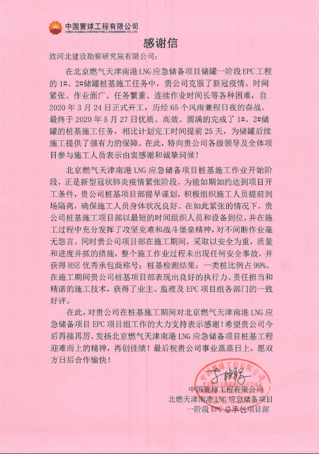 由我公司承建的北京燃?xì)馓旖蚰细跮NG應(yīng)急儲備項目1#、2#儲罐樁基工程,自2020年3月24日正式開工,歷經(jīng)65個日夜的奮戰(zhàn),最終于2020年5月27日優(yōu)質(zhì)、高效、圓滿的完成了1#、2#儲罐的樁基施工任務(wù)。中國寰球工程有限公司北京燃?xì)馓旖蚰细跮NG應(yīng)急儲備項目儲罐一階段EPC項目組,對我公司北燃樁基項目組表示由衷的感謝,感謝我公司領(lǐng)導(dǎo)及全體項目施工人員的辛勤付出,在克服了新冠疫情、時間緊張、作業(yè)面廣、任務(wù)繁重、連續(xù)作業(yè)時間長等各種困難的情況下,奮勇向前,較原定工期提前25天完成施工任務(wù),為項目后續(xù)施工帶來了強有力的工期保障。同時對我公司在樁基施工期間對北京燃?xì)馓旖蚰细跮NG應(yīng)急儲備項目EPC項目組工作的大力支持表示感謝!希望我公司今后再接再厲,繼續(xù)發(fā)揚迎難而上的精神,再創(chuàng)佳績!