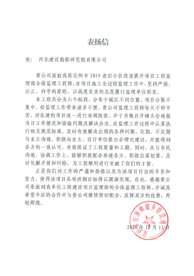 2020年12月我公司收到來自定州市住房和城鄉(xiāng)建設(shè)局關(guān)于定州市2019老舊小區(qū)改造提升項目監(jiān)理工程的表揚(yáng)信,目前該項目已順利竣工驗收。雖然該項目要求時間緊、任務(wù)重,但在監(jiān)理過程中我們公司嚴(yán)格按照相關(guān)規(guī)范、標(biāo)準(zhǔn),科學(xué)管理,嚴(yán)謹(jǐn)認(rèn)真負(fù)責(zé)的工作作風(fēng),保證了該項目按期完工,給各方留下了深刻的印象,不僅得到了定州市住房和城鄉(xiāng)建設(shè)局的高度認(rèn)可和贊譽(yù),還贏得了周邊市民的一致好評,樹立了良好的口碑和信譽(yù),為躋身定州建筑市場更好擴(kuò)展業(yè)務(wù)奠定了基礎(chǔ)。