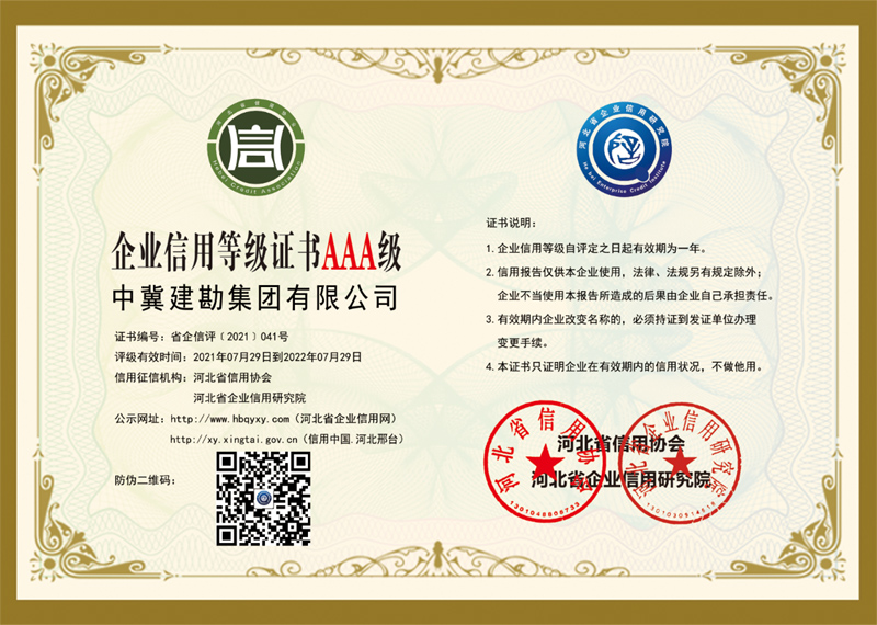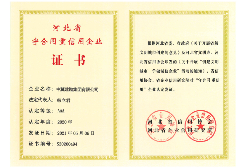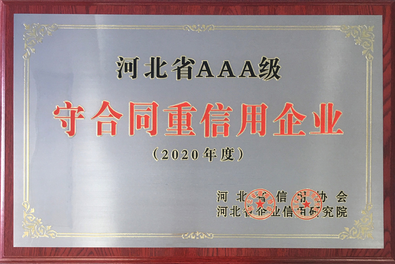 根據河北省信用辦、河北省信用協會等七部門印發的《關于開展“推進誠信建設共建信用河北”的活動方案》的通知,河北省信用協會、河北省企業信用研究院對“守合同重信用”企業進行認定,我公司繼續被評定為“河北省AAA級守合同重信用企業”。