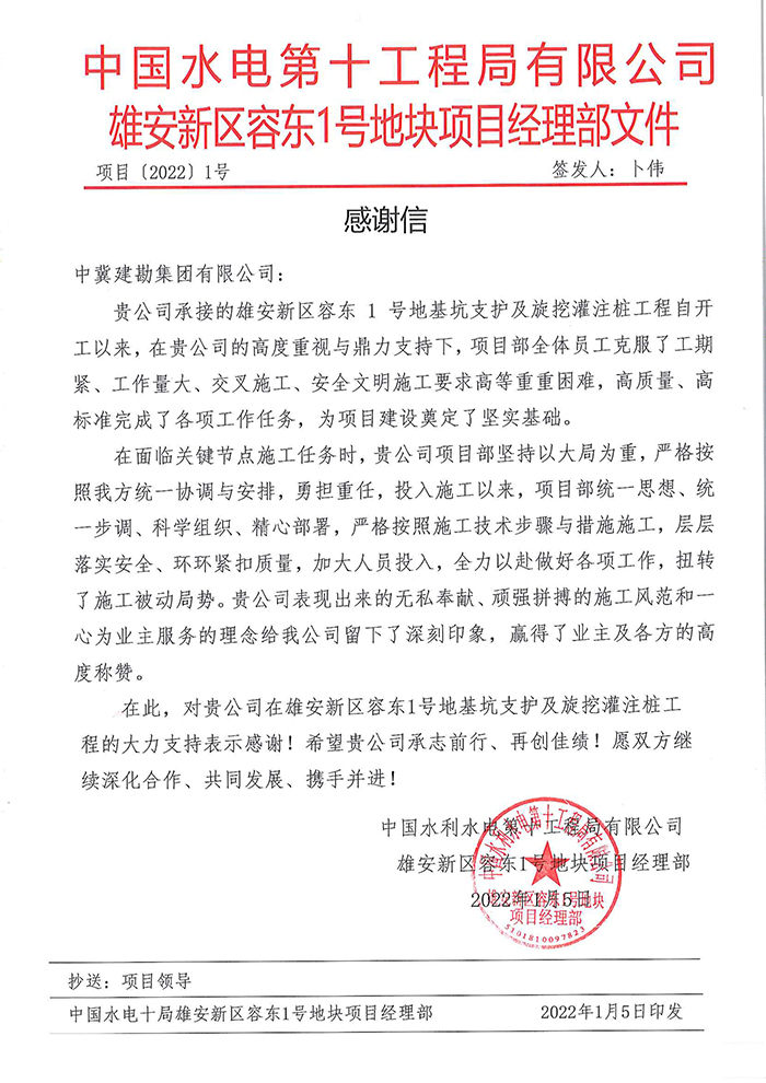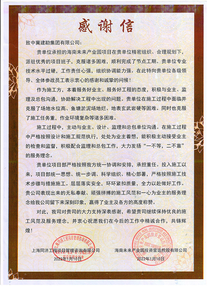 公司連續收到業主及總包方發來的表揚信及榮譽稱號