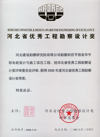 茌平信發(fā)華宇鋁電樁基設計與施工項目獲河北省優(yōu)秀工程勘察設計三等獎。