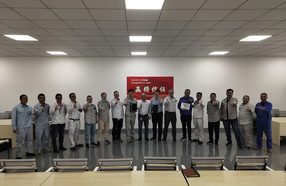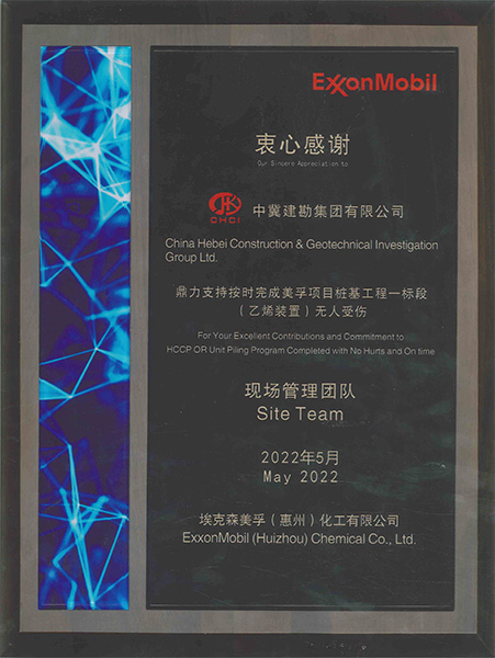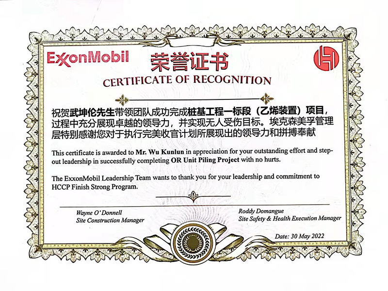 5月30日,埃克森美孚(惠州)化工有限公司召開2022年工作表彰大會(huì),我公司參建的惠州美孚乙烯一期樁基工程項(xiàng)目部,在參建的30余家施工單位中以優(yōu)異的成績,榮獲“優(yōu)秀管理團(tuán)隊(duì)”稱號(hào),生產(chǎn)設(shè)備科科長兼項(xiàng)目經(jīng)理武坤倫榮獲 “卓越領(lǐng)導(dǎo)力”個(gè)人榮譽(yù)證書,項(xiàng)目部每位員工都收到了業(yè)主頒發(fā)的獎(jiǎng)品。