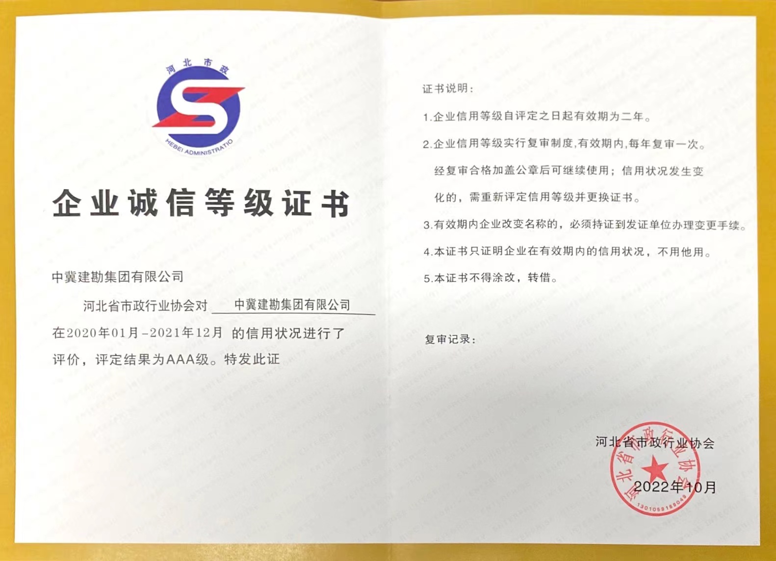 近日,河北省市政行業協會組織專家對行政主管部門初審推薦的誠信企業申報單位進行了集中評審,并經領導小組審定和網上公示等程序,我公司被評定為2021年度河北省市政行業AAA級誠信企業。