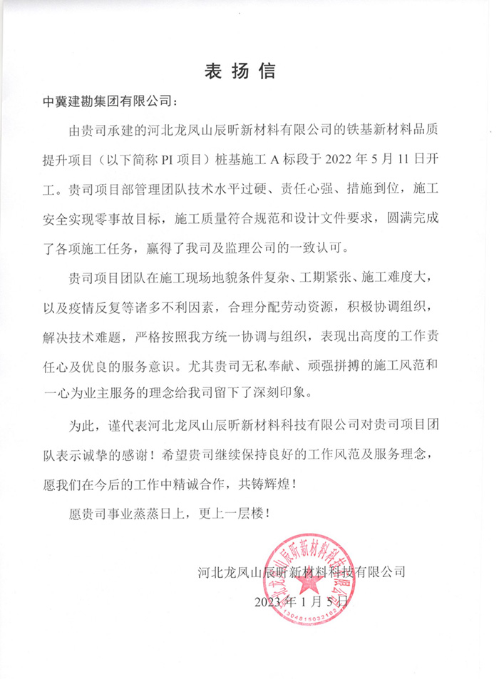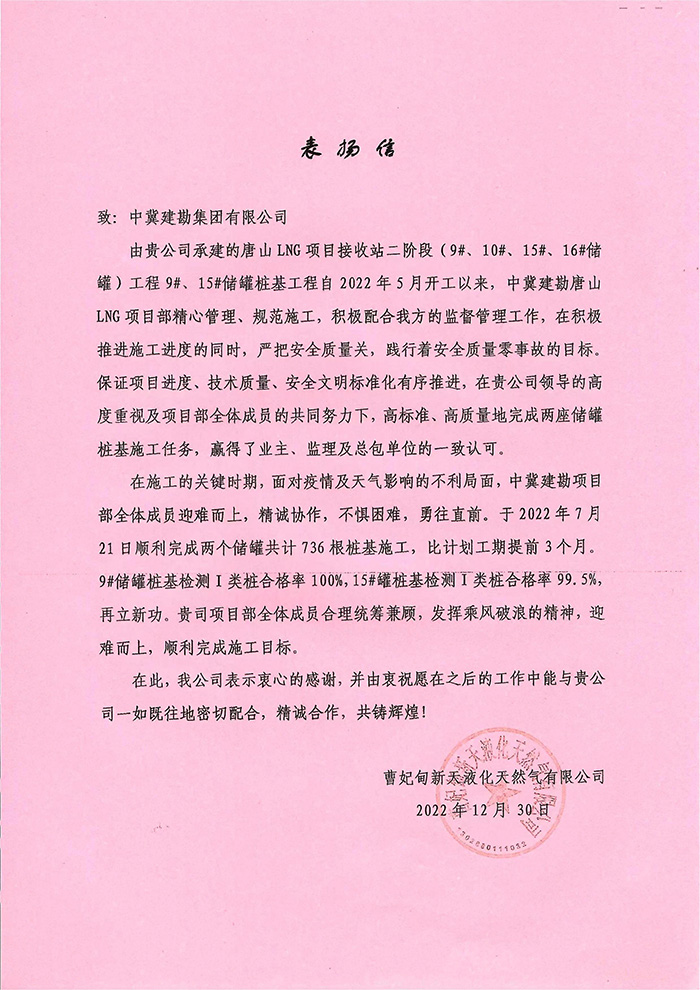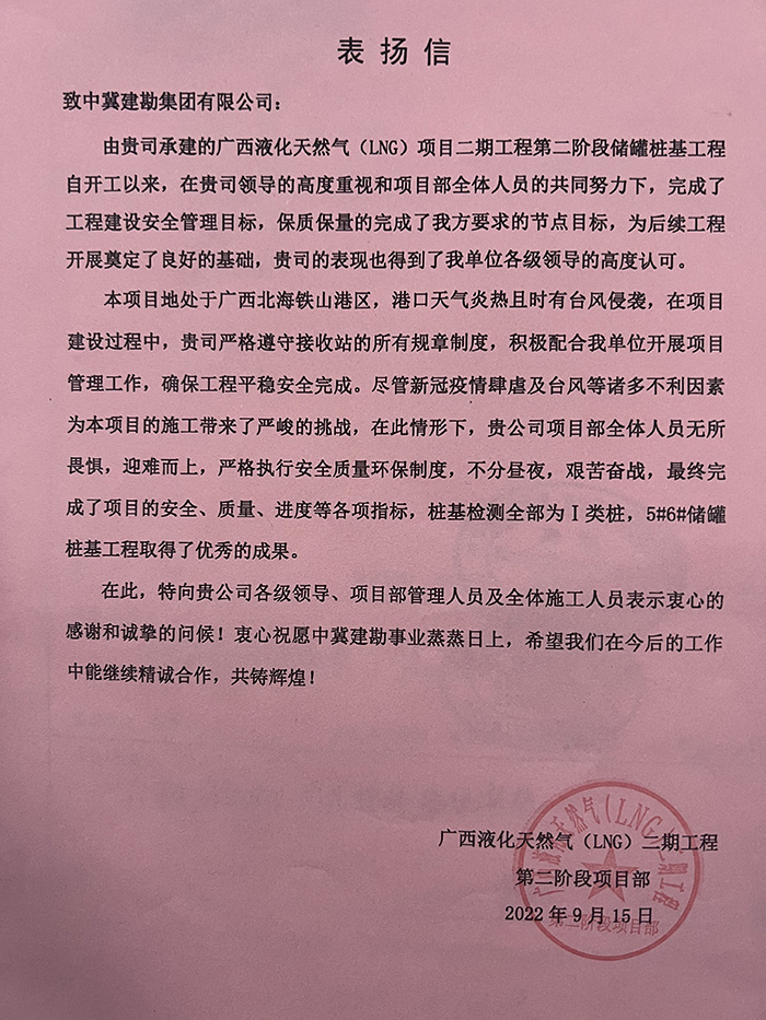 2022年12月30日我公司收到業主曹妃甸新天液化天然氣有限公司發來的表揚信。由我公司承建的唐山LNG項目接收站二階段(9#、10#、15#、16#儲罐)工程9#、15#儲罐樁基工程,主要施工內容為736根樁徑1.4m、樁長71m/74m混凝土灌注樁,本項目自2022年5月31日開工以來,在唐山LNG項目部精心管理、規范施工下,嚴把安全質量關,踐行著安全質量零事故目標,于2022年7月21日順利完成所有施工任務,贏得業主、監理及總包的一致認可。樁基檢測完成后,9#儲罐樁基檢測I類樁率100%,15#儲罐I類樁率99.5%,再創新高。在施工過程中,項目部全體成員面對惡劣天氣的不利影響及新冠疫情肆虐的局面,迎難而上,精誠協作,砥礪前行,淋漓盡致地詮釋了建勘人的鐵軍精神,為項目順利完成奠定堅實基礎。