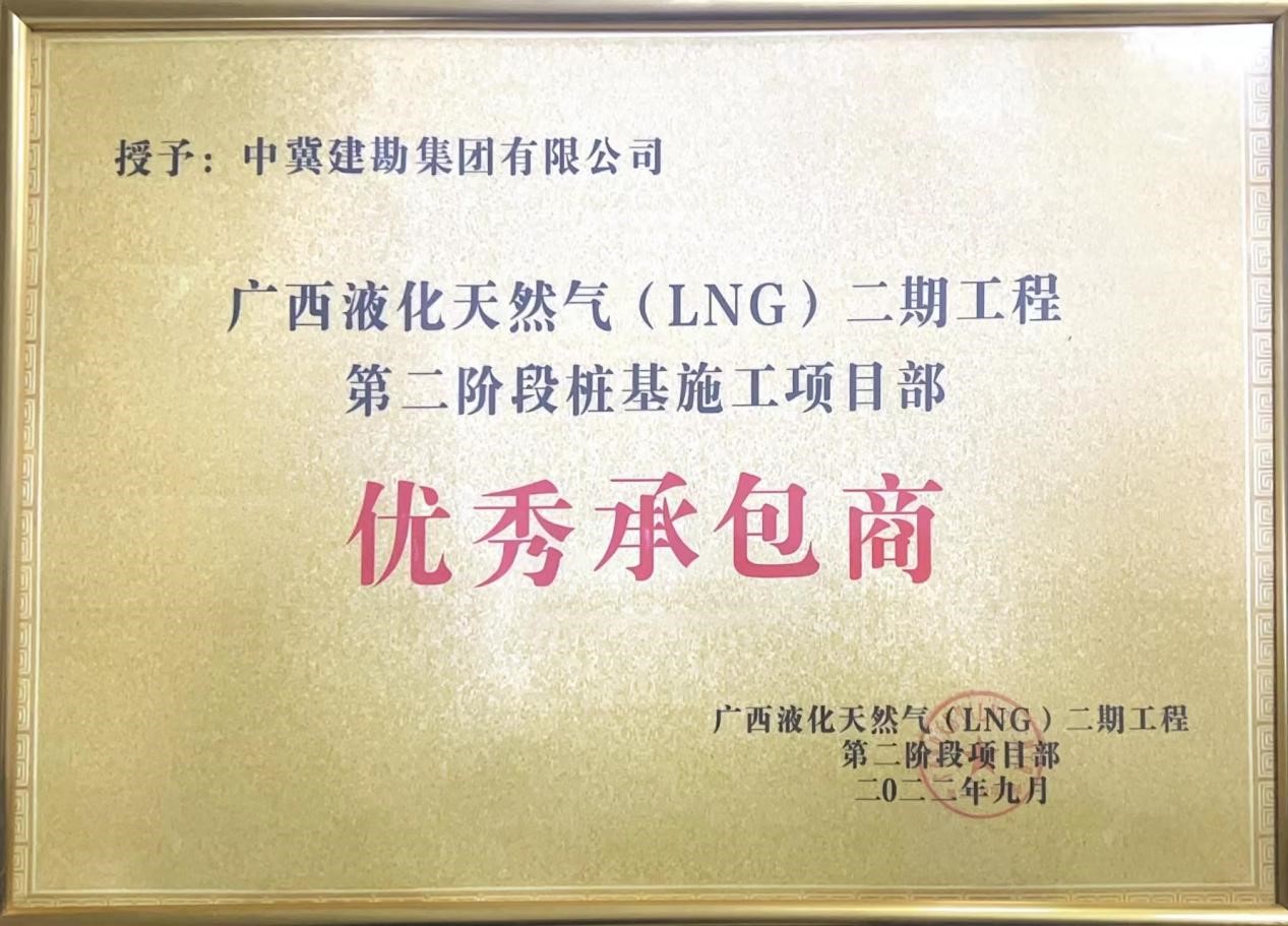 廣西液化天然氣LNG項目5#6#儲罐樁基項目是國家管網集團北海液化天然氣有限責任公司非常重視的項目。我公司自2022年04月承接了廣西LNG二期項目儲罐樁基施工,本項目于2022年5月20日開始,7月11日完成。從施工開始,本項目24小時晝夜不間斷施工,為保障工程高質量高效率完成,施工期間,建設單位、PMC單位、監理單位及施工單位配備了充足的管理人員及施工人員,在疫情肆虐,天氣炎熱,雨季臺風等一系列困難重重之下,廣西LNG項目部全體員工保持高度的工作熱情,克服一切艱難險阻,順利完成了樁基施工全部任務。樁基檢測結果全部為Ⅰ類樁,保質保量的完成了各個里程碑節點目標,榮獲國家管網集團北海液化天然氣有限責任公司廣西北海LNG二期項目部的表揚信及優秀優秀承包商集體榮譽。