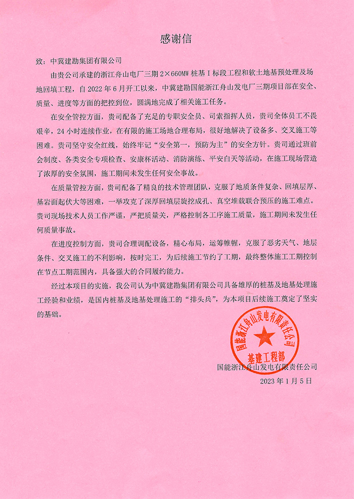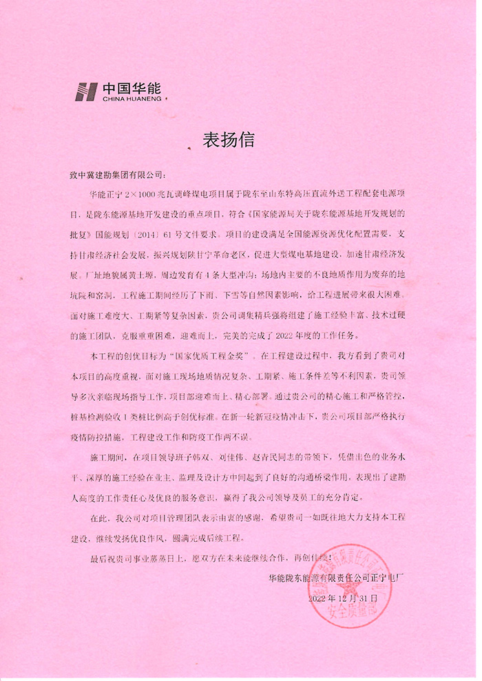 我公司華能甘肅正寧電廠二期工程項目部收到業主方華能隴東能源公司正寧電廠發來的表揚信,施工期間,在項目領導的帶領下,憑借出色的業務水平、深厚的施工經驗在業主、監理及設計方中間起到了良好的溝通橋梁作用。本工程的創優目標為“國家優質工程金獎”,我單位負責的B標段樁基檢測驗收I類樁比例高于創優標準。在新一輪新冠疫情沖擊下,項目部嚴格執行疫情防控措施,工程建設工作和防疫工作兩不誤表現出了建勘人高度的工作責任心及優良的服務意識,贏得了華能隴東能源公司領導及員工的充分肯定。