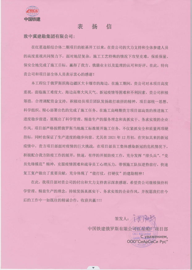 俄羅斯海參崴紅星造船綜合體(二期)項目,收到中國鐵建俄羅斯紅星船廠項目部的表揚信,施工期間,在項目領導的帶領下,項目部統一思想、科學組織,經過305天的奮戰,項目部完成了質量安全零事故,保質保量促進生產的任務目標。我公司負責的302、303、304廠房樁基檢測驗收全部合格。在施工高峰期克服了 新冠疫情、高寒天氣、俄烏戰爭影響等諸多困難和不利因素,采取24小時不間斷施工,積極調配合理高效的推進施工進度穩步前進。尤其在突如其來的新冠疫情中,項目部面對疫情的巨大挑戰,積極采取措施,配合防疫工作的展開,快速,有序的開展隔離工作,安撫感染人員恐慌情緒。這種科學防疫、積極組織為后期快速復工復產做出了重要貢獻,得到了總包單位的充分肯定和表揚。