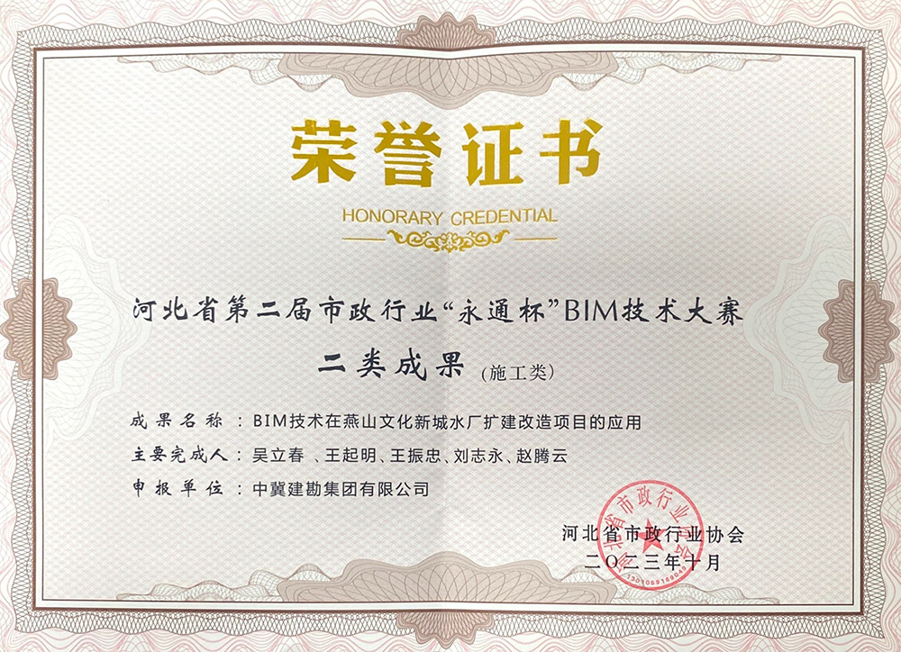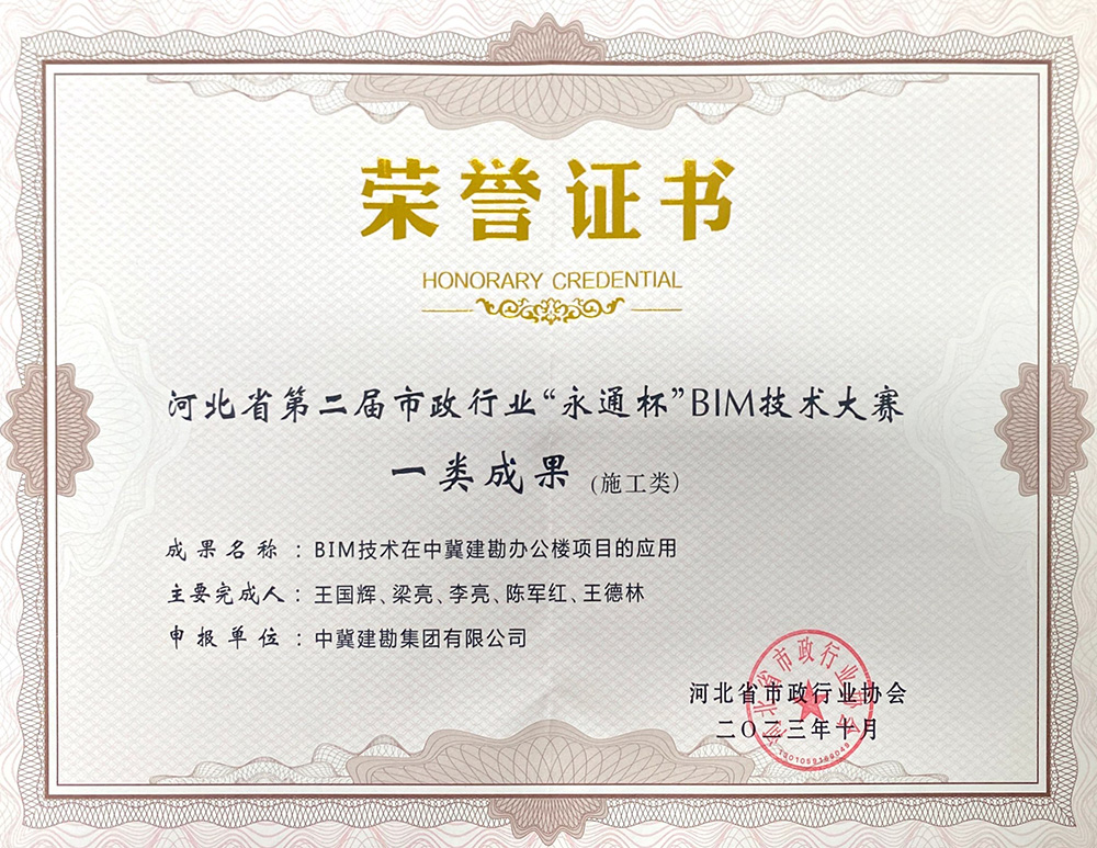 近日,河北省市政行業(yè)協(xié)會發(fā)文《關(guān)于公布河北省市政行業(yè)第二屆“永通杯”BIM技術(shù)應(yīng)用大賽結(jié)果的通知》(冀市協(xié){2023}37號),我公司參賽項目“BIM技術(shù)在中冀建勘辦公樓項目的應(yīng)用”項目榮獲一類成果、“BIM技術(shù)在燕山文化新城水廠擴建改造項目的應(yīng)用”項目榮獲二類成果。