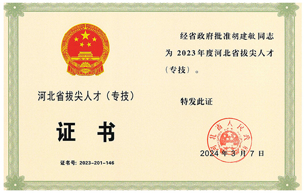 經(jīng)公司組織申報(bào),石家莊市鹿泉區(qū)人民政府、石家莊市人民政府推薦,河北省人力資源和社會保障廳組織評審、答辯,河北省人民政府批準(zhǔn),胡建敏同志榮獲2023年度河北省拔尖人才(專技)。