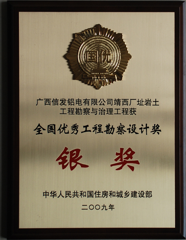 2010年7月6日,住房和城鄉(xiāng)建設(shè)部在北京召開2008年度全國優(yōu)秀工程勘察設(shè)計(jì)獎(jiǎng)?lì)C獎(jiǎng)大會(huì),我公司“廣西信發(fā)鋁電有限公司靖西廠址巖土工程勘察與治理”項(xiàng)目被授予全國優(yōu)秀工程勘察設(shè)計(jì)銀獎(jiǎng)獎(jiǎng)牌。