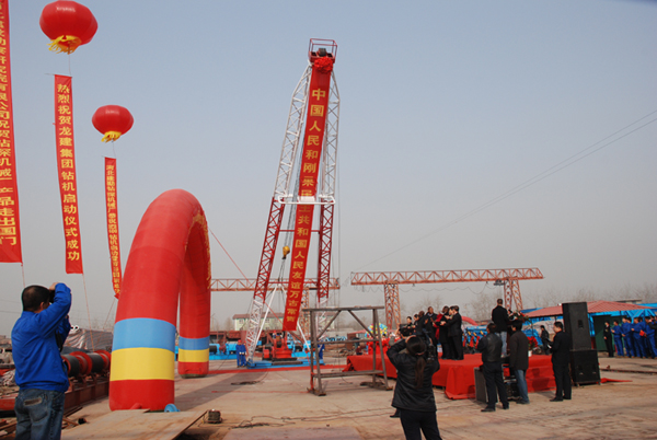 2008年12月9日,在我公司成立55周年的光輝時(shí)刻,剛果民主共和國(guó)東開賽省總督那茍伊·卡散基閣下,布卡薩先生,賽詩(shī)顧問(wèn)及駐華參贊王維麗女士一行與北京龍建集團(tuán)總裁楊光烈先生,在我公司梁總經(jīng)理及鉆探機(jī)械廠馬廠長(zhǎng)的陪同下,在機(jī)械廠南廠區(qū)參加了SPS-600鉆機(jī)、A18米鉆塔赴剛果施工的啟動(dòng)暨剪彩儀式。