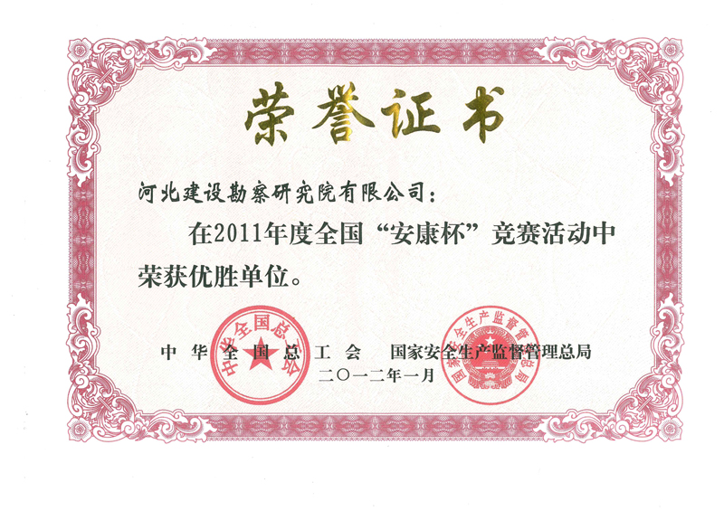 公司在2011年度“安康杯”競(jìng)賽活動(dòng)中,被中華全國(guó)總工會(huì)、國(guó)家安全生產(chǎn)監(jiān)督管理總局評(píng)為優(yōu)勝單位,這是我公司連續(xù)第八年獲此殊榮。
